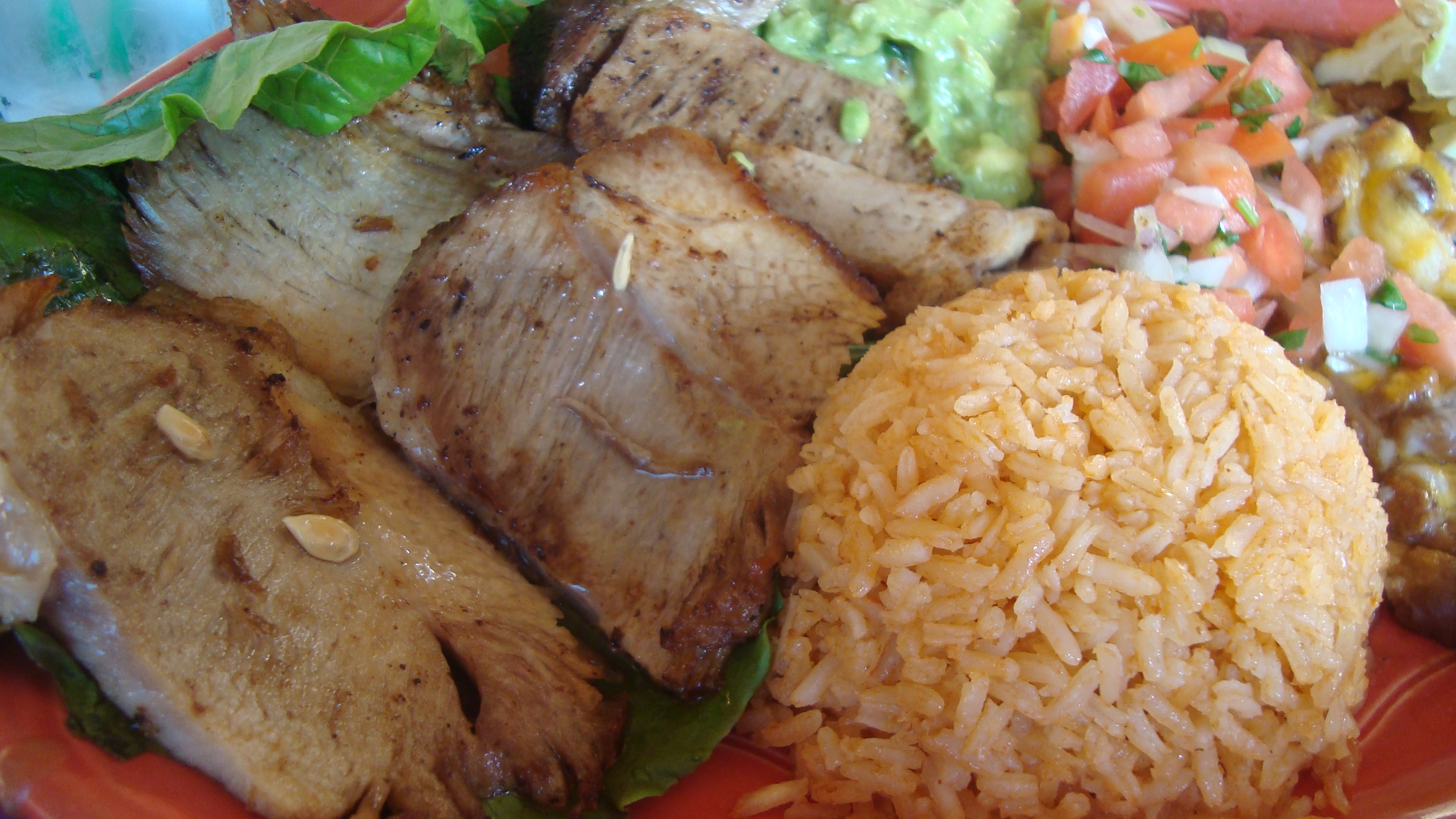Carnitas are a traditional form of pork that is marinated and slow roasted. These thick chunks came with the traditional rice, beans, salsa, flour tortillas, and guacamole. The Carnitas were very nice. I used the tortillas to make my own burritos, ’cause that’s how I roll.