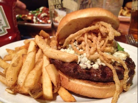 The burger was covered with cajun spices, smothered with crumbled blue cheese, and topped with a scattering of shoe string onions…