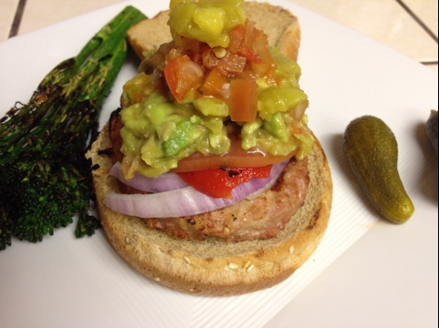 I topped this turkey burger with a lot of the stuff I throw in my Killer Guacamole. It’s got a nice slice of onion, tomato, and roasted red bell pepper. I mashed the avocado with salt, pepper, and a touch of mild deli salsa. On top, there’s a dab of salsa and diced chiles.
