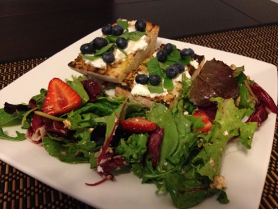 Grilled Ciabatta with Blueberries, Basil, Ricotta, and Honey and a Strawberry and Goat Cheese Mixed Green Salad