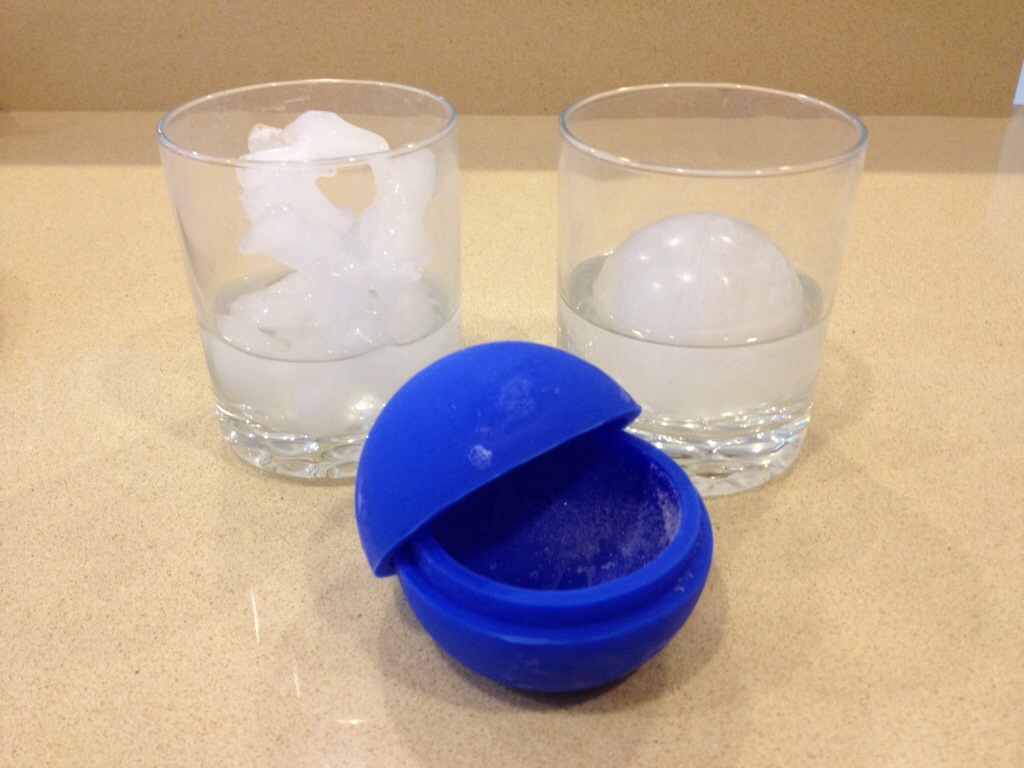 Step 1: Get yourself two glasses. Put ice cubes in one of ’em, and an ice ball in the other. Add two ounces of water to each glass.