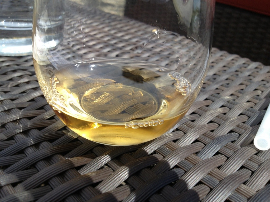 Color: Pale golden-yellow. Very similar to the Riesling (minus the sloshiness of the swirl, of course).