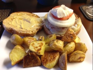 Cheddar Turkey Burger with Horseradish Aioli and Herb Roasted Potatoes