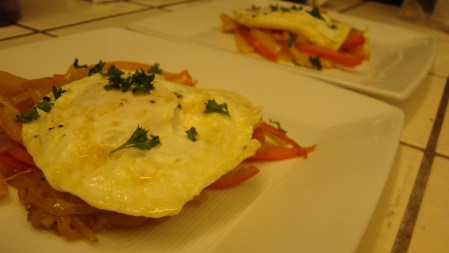 Piperade is a spanish style of sauted onions and peppers made with a little sugar and vinegar. Immediately, when I sat down to eat this thing, I broke open the egg to let the yolk out to mix around with the peppers. The egg was definitely rich, and went well with the sweet and tangy peppers. The egg was good, but I still don’t know why anyone would ever go out of their way to eat one.