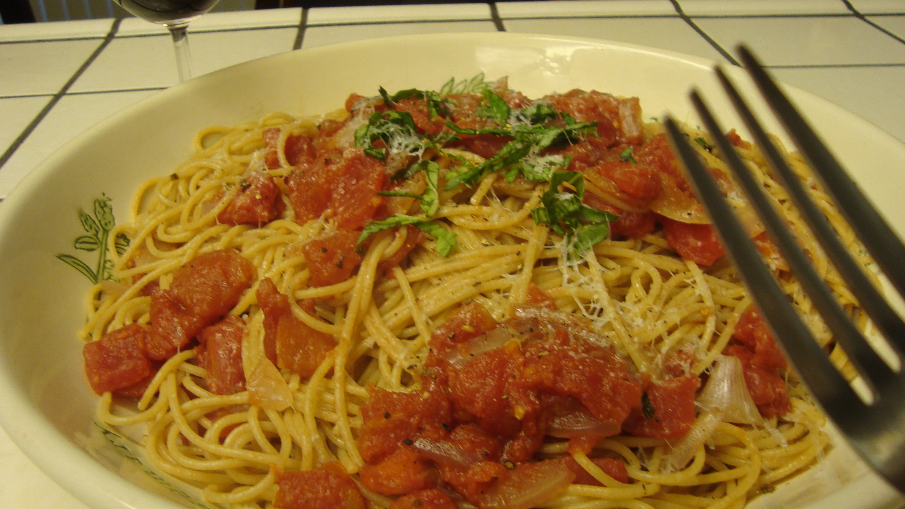 When the pasta was ready, I tossed in the sauce, along with some freshly grated parmigiano-reggiano cheese and some basil.