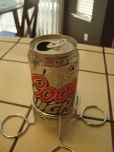 Next, I got a can of Coors Lite and poured half of it out into a measuring cup for later. I put a bunch of holes in the top of the can, sprinkled some of that seasoning into the can, and placed the can in a special "beer can chicken rack" (Yup... Those exist too!).