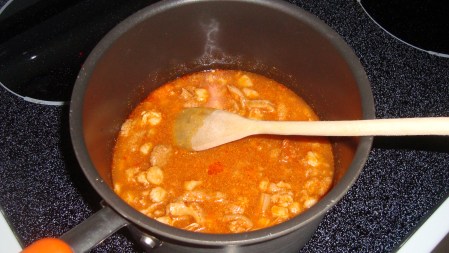 For the sauce, I sweated some onions in olive oil. Then I deglazed the pan with a splash of the Chateau Du Seguinier (Why not?). After the wine steamed off, I threw in a can of diced tomatoes, salt n’ peppa, and some cumin and dried oregano.
