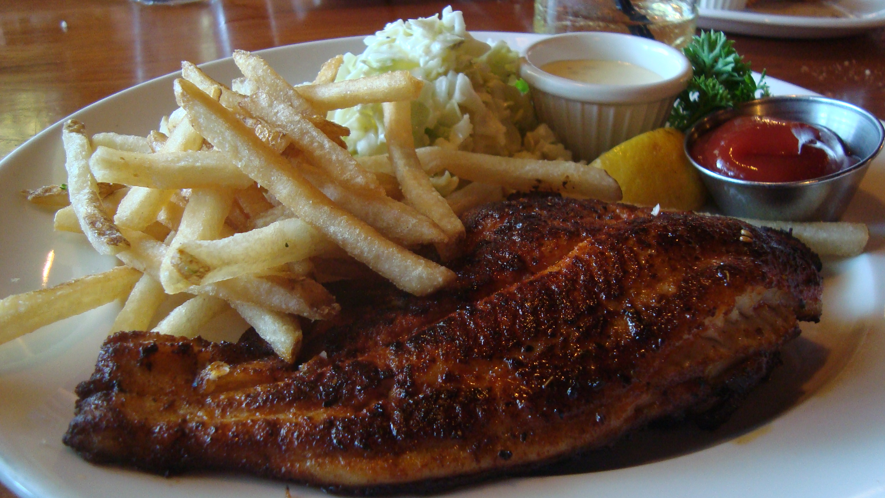 For the main course, I got me some catfish with fries and coleslaw. Triple yum, foo!