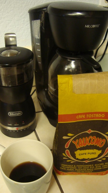 The fab four: Mug, Grinder, Beans, and a Coffee Pot