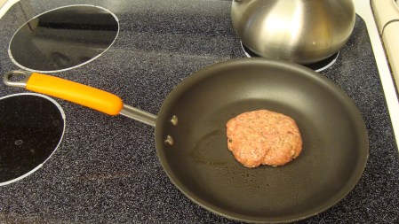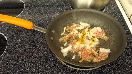 I threw the ground beef into a hot ass pan. Yes. That is a Rachel Ray omelette pan. It rules. That, and the handle is orange.