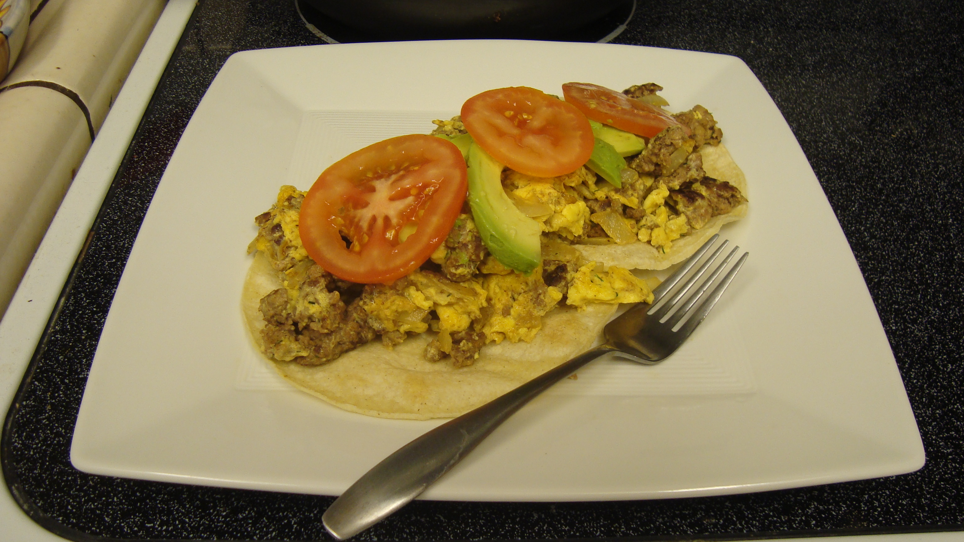 Add egg, and scramble it up. Plate on top of the two interlocking tortillas. Top with half an avocado and 3 tomato slices. Joe's Special? More like Jeff's Rad! Am I right?