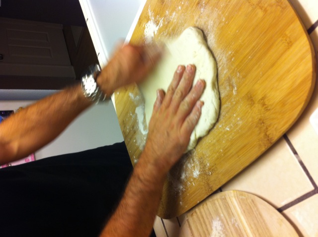 Using hella flour on a cutting board, I prefer to stretch my dough by hand instead of rolling it. That's right. My hand is blurry. Don't judge me!