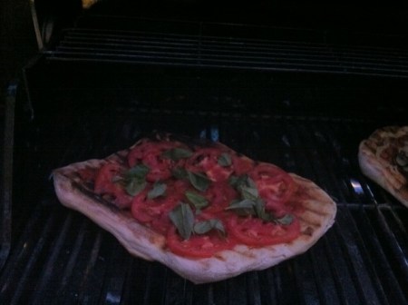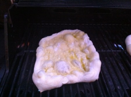 Brush the dough with olive oil, and place it on the grill (oil side down) for 3 - 5 minutes. Brush the exposed side of the dough with olive oil while you are waiting.