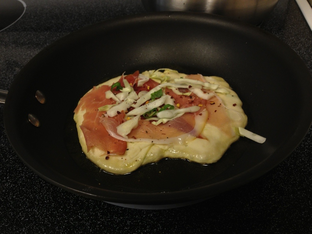 Each of the pancakes was cooked over medium heat in an omelet pan with a little bit of olive oil for about 3 and a half minutes each side. To finish the pancake, I topped it with some prosciutto and a little bit of the leftover cabbage and scallions.